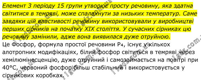 Елемент 3 періоду 15 групи утворює просту речовину, яка здатна світитися в темряві, може спалахнути за низьких температур. Саме завдяки цій властивості речовину використовували у виробництві перших сірників на початку ХІХ століття. У сучасних сірниках цю речовину замінили, адже вона виявилася дуже отруйною. Це Фосфор, формула простої речовини P₄, існує у кількох алотропних модифікаціях, білий фосфор світиться в темряві через хемілюмінесценцію, дуже отруйний і самозаймається на повітрі при 40°C, червоний фосфор більш стабільний і використовується у сірникових коробках.