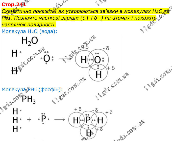 Схематично покажіть, як утворюються зв'язки в молекулах H₂O та PH₃. Позначте часткові заряди (δ+ і δ−) на атомах і покажіть напрямок полярності. Молекула H₂O (вода): Молекула PH₃ (фосфін):