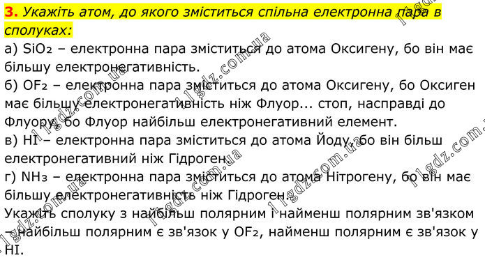 3. Укажіть атом, до якого зміститься спільна електронна пара в сполуках: а) SiO₂ – електронна пара зміститься до атома Оксигену, бо він має більшу електронегативність. б) OF₂ – електронна пара зміститься до атома Оксигену, бо Оксиген має більшу електронегативність ніж Флуор... стоп, насправді до Флуору, бо Флуор найбільш електронегативний елемент. в) HI – електронна пара зміститься до атома Йоду, бо він більш електронегативний ніж Гідроген. г) NH₃ – електронна пара зміститься до атома Нітрогену, бо він має більшу електронегативність ніж Гідроген. Укажіть сполуку з найбільш полярним і найменш полярним зв'язком – найбільш полярним є зв'язок у OF₂, найменш полярним є зв'язок у HI.