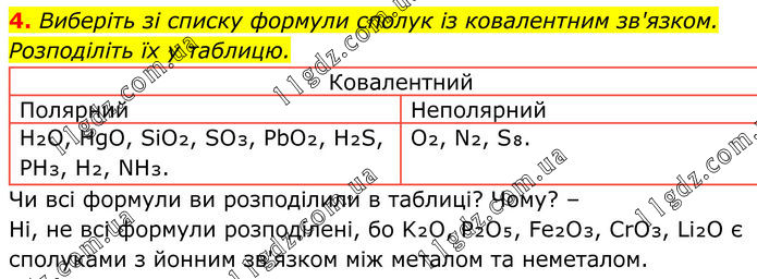 4. Виберіть зі списку формули сполук із ковалентним зв'язком. Розподіліть їх у таблицю. Ковалентний Полярний Неполярний H₂O, HgO, SiO₂, SO₃, PbO₂, H₂S, PH₃, H₂, NH₃. O₂, N₂, S₈. Чи всі формули ви розподілили в таблиці? Чому? – Ні, не всі формули розподілені, бо K₂O, P₂O₅, Fe₂O₃, CrO₃, Li₂O є сполуками з йонним зв'язком між металом та неметалом.