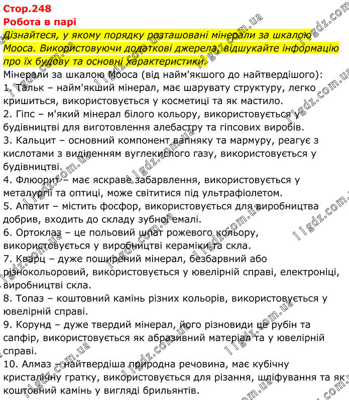 Робота в парі Дізнайтеся, у якому порядку розташовані мінерали за шкалою Мооса. Використовуючи додаткові джерела, відшукайте інформацію про їх будову та основні характеристики. Мінерали за шкалою Мооса (від найм'якшого до найтвердішого): 1. Тальк – найм'якший мінерал, має шарувату структуру, легко кришиться, використовується у косметиці та як мастило. 2. Гіпс – м'який мінерал білого кольору, використовується у будівництві для виготовлення алебастру та гіпсових виробів. 3. Кальцит – основний компонент вапняку та мармуру, реагує з кислотами з виділенням вуглекислого газу, використовується у будівництві. 4. Флюорит – має яскраве забарвлення, використовується у металургії та оптиці, може світитися під ультрафіолетом. 5. Апатит – містить фосфор, використовується для виробництва добрив, входить до складу зубної емалі. 6. Ортоклаз – це польовий шпат рожевого кольору, використовується у виробництві кераміки та скла. 7. Кварц – дуже поширений мінерал, безбарвний або різнокольоровий, використовується у ювелірній справі, електроніці, виробництві скла. 8. Топаз – коштовний камінь різних кольорів, використовується у ювелірній справі. 9. Корунд – дуже твердий мінерал, його різновиди це рубін та сапфір, використовується як абразивний матеріал та у ювелірній справі. 10. Алмаз – найтвердіша природна речовина, має кубічну кристалічну гратку, використовується для різання, шліфування та як коштовний камінь у вигляді брильянтів.