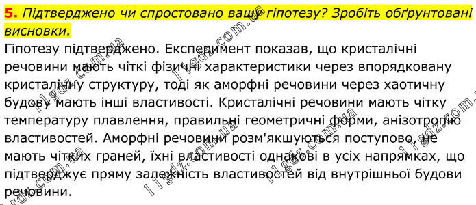5. Підтверджено чи спростовано вашу гіпотезу? Зробіть обґрунтовані висновки. Гіпотезу підтверджено. Експеримент показав, що кристалічні речовини мають чіткі фізичні характеристики через впорядковану кристалічну структуру, тоді як аморфні речовини через хаотичну будову мають інші властивості. Кристалічні речовини мають чітку температуру плавлення, правильні геометричні форми, анізотропію властивостей. Аморфні речовини розм'якшуються поступово, не мають чітких граней, їхні властивості однакові в усіх напрямках, що підтверджує пряму залежність властивостей від внутрішньої будови речовини.