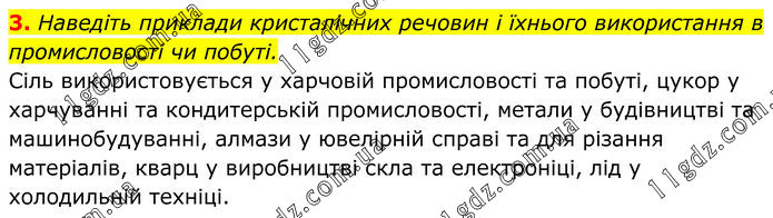3. Наведіть приклади кристалічних речовин і їхнього використання в промисловості чи побуті. Сіль використовується у харчовій промисловості та побуті, цукор у харчуванні та кондитерській промисловості, метали у будівництві та машинобудуванні, алмази у ювелірній справі та для різання матеріалів, кварц у виробництві скла та електроніці, лід у холодильній техніці.