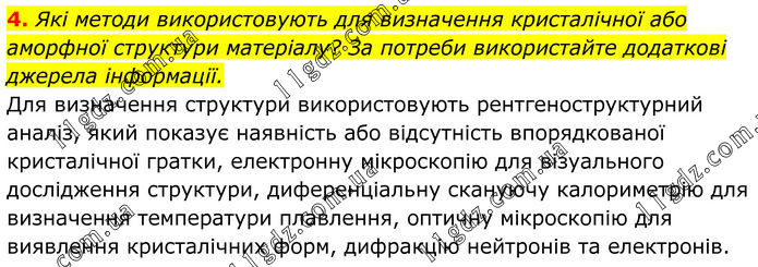 4. Які методи використовують для визначення кристалічної або аморфної структури матеріалу? За потреби використайте додаткові джерела інформації. Для визначення структури використовують рентгеноструктурний аналіз, який показує наявність або відсутність впорядкованої кристалічної гратки, електронну мікроскопію для візуального дослідження структури, диференціальну скануючу калориметрію для визначення температури плавлення, оптичну мікроскопію для виявлення кристалічних форм, дифракцію нейтронів та електронів.