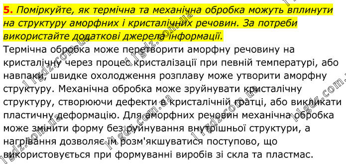 5. Поміркуйте, як термічна та механічна обробка можуть вплинути на структуру аморфних і кристалічних речовин. За потреби використайте додаткові джерела інформації. Термічна обробка може перетворити аморфну речовину на кристалічну через процес кристалізації при певній температурі, або навпаки, швидке охолодження розплаву може утворити аморфну структуру. Механічна обробка може зруйнувати кристалічну структуру, створюючи дефекти в кристалічній гратці, або викликати пластичну деформацію. Для аморфних речовин механічна обробка може змінити форму без руйнування внутрішньої структури, а нагрівання дозволяє їм розм'якшуватися поступово, що використовується при формуванні виробів зі скла та пластмас.