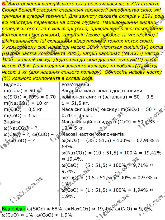 6. Виготовлення венеційського скла розпочалося ще в XIII столітті. Склярі Венеції створили спеціальні технології виробництва скла, які тримали в суворій таємниці. Для захисту секретів склярів у 1291 році всі майстерні перенесли на острів Мурано. Найвідомішими видами венеційського скла є мільфіорі (скло, прикрашене різнокольоровими квітковими візерунками), кристалін (дуже прозоре та чисте скло) і філігранне скло (зі складними візерунками з тонких ниток скла). У кольоровому склі мільфіорі масою 50 кг міститься силіцій(IV) оксид (масова частка компонента 70%), натрій карбонат (Na₂CO₃) масою 10 кг і кальцій оксид. Додатково до скла додали: купрум(II) оксид масою 0,5 кг (для надання зеленого кольору) та кобальт(II) оксид масою 1 кг (для надання синього кольору). Обчисліть масову частку (%) кожного компонента в складі скла. Відомо: m(скла) = 50 кг ω(SiO₂) = 70% = 0,70 m(Na₂CO₃) = 10 кг m(CuO) = 0,5 кг m(CoO) = 1 кг Розв'язання: Загальна маса скла з додатковими компонентами: m(загальна) = 50 + 0,5 + 1 = 51,5 кг. Маса силіцій(IV) оксиду: m(SiO₂) = 50 • 0,70 = 35 кг. Маса кальцій оксиду: m(CaO) = 50 – 35 – 10 = 5 кг. Масові частки компонентів: ω(SiO₂) = (35 : 51,5) • 100% = 67,96% ≈ 68%. ω(Na₂CO₃) = (10 : 51,5) • 100% = 19,42% ≈ 19,4%. ω(CaO) = (5 : 51,5) • 100% = 9,71% ≈ 9,7%. ω(CuO) = (0,5 : 51,5) • 100% = 0,97% ≈ 1%. ω(CoO) = (1 : 51,5) • 100% = 1,94% ≈ 1,9%. Знайти: ω(Na₂CO₃) – ?, ω(CaO) – ?, ω(CuO) – ?, ω(CoO) – ? Відповідь: ω(SiO₂) ≈ 68%, ω(Na₂CO₃) ≈ 19,4%, ω(CaO) ≈ 9,7%, ω(CuO) ≈ 1%, ω(CoO) ≈ 1,9%.