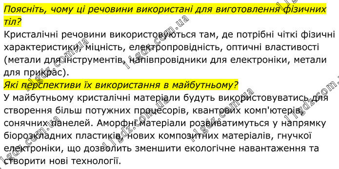 Поясніть, чому ці речовини використані для виготовлення фізичних тіл? Кристалічні речовини використовуються там, де потрібні чіткі фізичні характеристики, міцність, електропровідність, оптичні властивості (метали для інструментів, напівпровідники для електроніки, метали для прикрас). Які перспективи їх використання в майбутньому? У майбутньому кристалічні матеріали будуть використовуватись для створення більш потужних процесорів, квантових комп'ютерів, сонячних панелей. Аморфні матеріали розвиватимуться у напрямку біорозкладних пластиків, нових композитних матеріалів, гнучкої електроніки, що дозволить зменшити екологічне навантаження та створити нові технології.