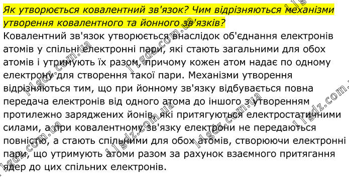 Як утворюється ковалентний зв'язок? Чим відрізняються механізми утворення ковалентного та йонного зв'язків? Ковалентний зв'язок утворюється внаслідок об'єднання електронів атомів у спільні електронні пари, які стають загальними для обох атомів і утримують їх разом, причому кожен атом надає по одному електрону для створення такої пари. Механізми утворення відрізняються тим, що при йонному зв'язку відбувається повна передача електронів від одного атома до іншого з утворенням протилежно заряджених йонів, які притягуються електростатичними силами, а при ковалентному зв'язку електрони не передаються повністю, а стають спільними для обох атомів, створюючи електронні пари, що утримують атоми разом за рахунок взаємного притягання ядер до цих спільних електронів.