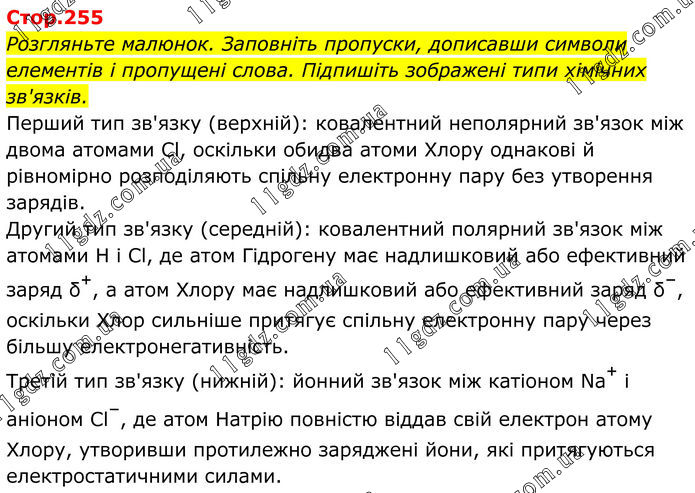 Розгляньте малюнок. Заповніть пропуски, дописавши символи елементів і пропущені слова. Підпишіть зображені типи хімічних зв'язків. Перший тип зв'язку (верхній): ковалентний неполярний зв'язок між двома атомами Cl, оскільки обидва атоми Хлору однакові й рівномірно розподіляють спільну електронну пару без утворення зарядів. Другий тип зв'язку (середній): ковалентний полярний зв'язок між атомами H і Cl, де атом Гідрогену має надлишковий або ефективний заряд δ⁺, а атом Хлору має надлишковий або ефективний заряд δ⁻, оскільки Хлор сильніше притягує спільну електронну пару через більшу електронегативність. Третій тип зв'язку (нижній): йонний зв'язок між катіоном Na⁺ і аніоном Cl⁻, де атом Натрію повністю віддав свій електрон атому Хлору, утворивши протилежно заряджені йони, які притягуються електростатичними силами.