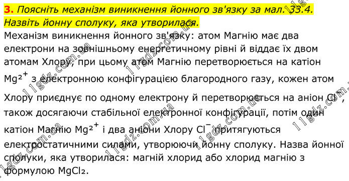 3. Поясніть механізм виникнення йонного зв'язку за мал. 33.4. Назвіть йонну сполуку, яка утворилася. Механізм виникнення йонного зв'язку: атом Магнію має два електрони на зовнішньому енергетичному рівні й віддає їх двом атомам Хлору, при цьому атом Магнію перетворюється на катіон Mg²⁺ з електронною конфігурацією благородного газу, кожен атом Хлору приєднує по одному електрону й перетворюється на аніон Cl⁻, також досягаючи стабільної електронної конфігурації, потім один катіон Магнію Mg²⁺ і два аніони Хлору Cl⁻ притягуються електростатичними силами, утворюючи йонну сполуку. Назва йонної сполуки, яка утворилася: магній хлорид або хлорид магнію з формулою MgCl₂.