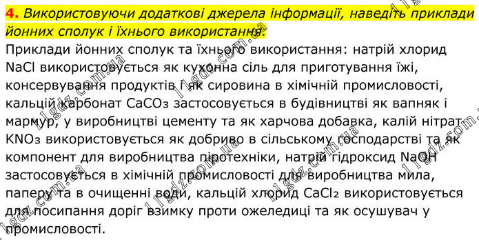 4. Використовуючи додаткові джерела інформації, наведіть приклади йонних сполук і їхнього використання. Приклади йонних сполук та їхнього використання: натрій хлорид NaCl використовується як кухонна сіль для приготування їжі, консервування продуктів і як сировина в хімічній промисловості, кальцій карбонат CaCO₃ застосовується в будівництві як вапняк і мармур, у виробництві цементу та як харчова добавка, калій нітрат KNO₃ використовується як добриво в сільському господарстві та як компонент для виробництва піротехніки, натрій гідроксид NaOH застосовується в хімічній промисловості для виробництва мила, паперу та в очищенні води, кальцій хлорид CaCl₂ використовується для посипання доріг взимку проти ожеледиці та як осушувач у промисловості.