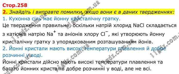 2. Знайдіть і виправте помилки, якщо вони є в даних твердженнях: 1. Кухонна сіль має йонну кристалічну гратку. Це твердження правильне, оскільки натрій хлорид NaCl складається з катіонів натрію Na⁺ та аніонів хлору Cl⁻, які утворюють йонну кристалічну гратку з упорядкованим розташуванням йонів. 2. Йонні кристали мають високі температури плавлення й добре розчинні у воді. Йонні кристали дійсно мають високі температури плавлення та багато йонних кристалів добре розчинні у воді, але не всі.