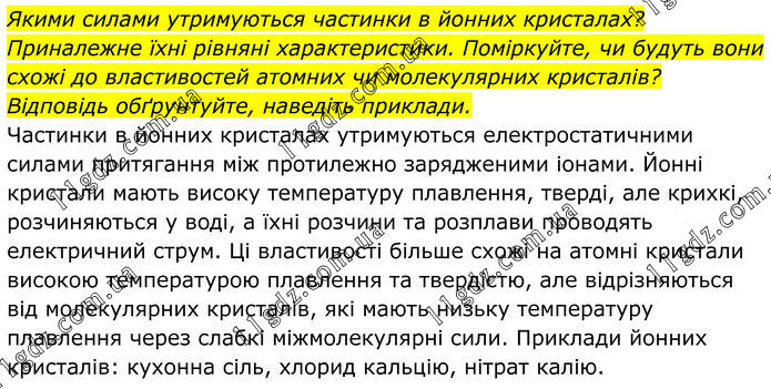 Якими силами утримуються частинки в йонних кристалах? Приналежне їхні рівняні характеристики. Поміркуйте, чи будуть вони схожі до властивостей атомних чи молекулярних кристалів? Відповідь обґрунтуйте, наведіть приклади. Частинки в йонних кристалах утримуються електростатичними силами притягання між протилежно зарядженими іонами. Йонні кристали мають високу температуру плавлення, тверді, але крихкі, розчиняються у воді, а їхні розчини та розплави проводять електричний струм. Ці властивості більше схожі на атомні кристали високою температурою плавлення та твердістю, але відрізняються від молекулярних кристалів, які мають низьку температуру плавлення через слабкі міжмолекулярні сили. Приклади йонних кристалів: кухонна сіль, хлорид кальцію, нітрат калію.