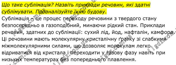 Що таке сублімація? Назвіть приклади речовин, які здатні сублімувати. Проаналізуйте їхню будову. Сублімація – це процес переходу речовини з твердого стану безпосередньо в газоподібний, минаючи рідкий стан. Приклади речовин, здатних до сублімації: сухий лід, йод, нафталін, камфора. Ці речовини мають молекулярну кристалічну ґратку зі слабкими міжмолекулярними силами, що дозволяє молекулам легко відриватися від кристала і переходити у газову фазу навіть при низьких температурах без попереднього плавлення.