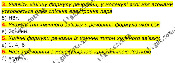 3. Укажіть хімічну формулу речовини, у молекулі якої між атомами утворюється одна спільна електронна пара б) HBr. 4. Укажіть тип хімічного зв'язку в речовині, формула якої CsF в) йонний. 5. Хімічні формули речовин із йонним типом хімічного зв'язку в) 1, 4, 6 6. Назва речовини з молекулярною кристалічною ґраткою б) водень.