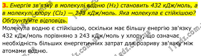 3. Енергія зв'язку в молекулі водню (H₂) становить 432 кДж/моль, а в молекулі хлору (Cl₂) — 243 кДж/моль. Яка молекула є стійкішою? Обґрунтуйте відповідь. Молекула водню є стійкішою, оскільки має більшу енергію зв'язку 432 кДж/моль порівняно з 243 кДж/моль у хлору, що означає необхідність більших енергетичних затрат для розриву зв'язку між атомами водню.