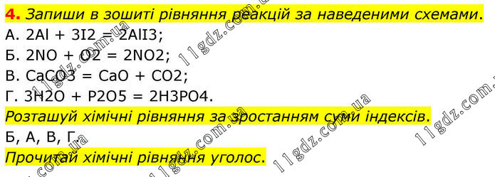 4. Запиши в зошиті рівняння реакцій за наведеними схемами. А. 2Al + 3I2 = 2AlI3; Б. 2NO + O2 = 2NO2; В. CaCO3 = CaO + CO2; Г. 3H2O + P2O5 = 2H3PO4. Розташуй хімічні рівняння за зростанням суми індексів. Б, А, В, Г. Прочитай хімічні рівняння уголос.