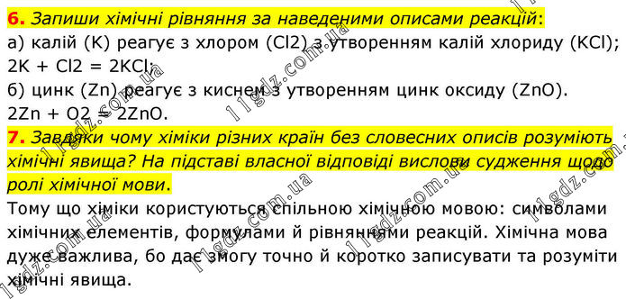 6. Запиши хімічні рівняння за наведеними описами реакцій: а) калій (K) реагує з хлором (Cl2) з утворенням калій хлориду (KCl); 2K + Cl2 = 2KCl; б) цинк (Zn) реагує з киснем з утворенням цинк оксиду (ZnO). 2Zn + O2 = 2ZnO. 7. Завдяки чому хіміки різних країн без словесних описів розуміють хімічні явища? На підставі власної відповіді вислови судження щодо ролі хімічної мови. Тому що хіміки користуються спільною хімічною мовою: символами хімічних елементів, формулами й рівняннями реакцій. Хімічна мова дуже важлива, бо дає змогу точно й коротко записувати та розуміти хімічні явища.