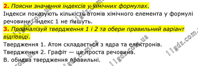 2. Поясни значення індексів у хімічних формулах. Індекси показують кількість атомів хімічного елемента у формулі речовини; індекс 1 не пишуть. 3. Проаналізуй твердження 1 і 2 та обери правильний варіант відповіді. Твердження 1. Атом складається з ядра та електронів. Твердження 2. Графіт — це проста речовина. В. обидва твердження правильні.