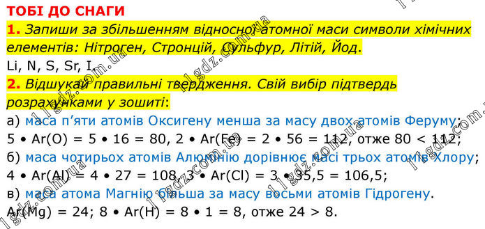 ТОБІ ДО СНАГИ 1. Запиши за збільшенням відносної атомної маси символи хімічних елементів: Нітроген, Стронцій, Сульфур, Літій, Йод. Li, N, S, Sr, I. 2. Відшукай правильні твердження. Свій вибір підтвердь розрахунками у зошиті: а) маса п’яти атомів Оксигену менша за масу двох атомів Феруму; 5 • Ar(O) = 5 • 16 = 80, 2 • Ar(Fe) = 2 • 56 = 112, отже 80 < 112; б) маса чотирьох атомів Алюмінію дорівнює масі трьох атомів Хлору; 4 • Ar(Al) = 4 • 27 = 108, 3 • Ar(Cl) = 3 • 35,5 = 106,5; в) маса атома Магнію більша за масу восьми атомів Гідрогену. Ar(Mg) = 24; 8 • Ar(H) = 8 • 1 = 8, отже 24 > 8.