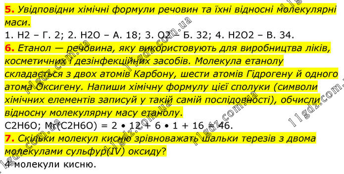 5. Увідповідни хімічні формули речовин та їхні відносні молекулярні маси. 1. H2 – Г. 2; 2. H2O – А. 18; 3. O2 – Б. 32; 4. H2O2 – В. 34. 6. Етанол — речовина, яку використовують для виробництва ліків, косметичних і дезінфекційних засобів. Молекула етанолу складається з двох атомів Карбону, шести атомів Гідрогену й одного атома Оксигену. Напиши хімічну формулу цієї сполуки (символи хімічних елементів записуй у такій самій послідовності), обчисли відносну молекулярну масу етанолу. C2H6O; Mr(C2H6O) = 2 • 12 + 6 • 1 + 16 = 46. 7. Скільки молекул кисню зрівноважать шальки терезів з двома молекулами сульфур(IV) оксиду? 4 молекули кисню.