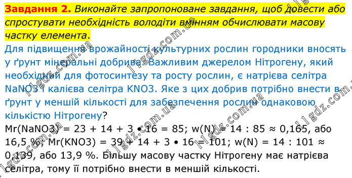Завдання 2. Виконайте запропоноване завдання, щоб довести або спростувати необхідність володіти вмінням обчислювати масову частку елемента. Для підвищення врожайності культурних рослин городники вносять у ґрунт мінеральні добрива. Важливим джерелом Нітрогену, який необхідний для фотосинтезу та росту рослин, є натрієва селітра NaNO3 і калієва селітра KNO3. Яке з цих добрив потрібно внести в ґрунт у меншій кількості для забезпечення рослин однаковою кількістю Нітрогену? Mr(NaNO3) = 23 + 14 + 3 • 16 = 85; w(N) = 14 : 85 ≈ 0,165, або 16,5 %; Mr(KNO3) = 39 + 14 + 3 • 16 = 101; w(N) = 14 : 101 ≈ 0,139, або 13,9 %. Більшу масову частку Нітрогену має натрієва селітра, тому її потрібно внести в меншій кількості.