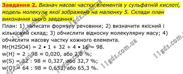 Завдання 2. Визнач масові частки елементів у сульфатній кислоті, модель молекули якої зображено на малюнку 5. Склади план виконання цього завдання. План: 1) записати формулу речовини; 2) визначити якісний і кількісний склад; 3) обчислити відносну молекулярну масу; 4) обчислити масову частку кожного елемента. Mr(H2SO4) = 2 • 1 + 32 + 4 • 16 = 98. w(H) = 2 : 98 ≈ 0,020, або 2,0 %; w(S) = 32 : 98 ≈ 0,327, або 32,7 %; w(O) = 64 : 98 ≈ 0,653, або 65,3 %.