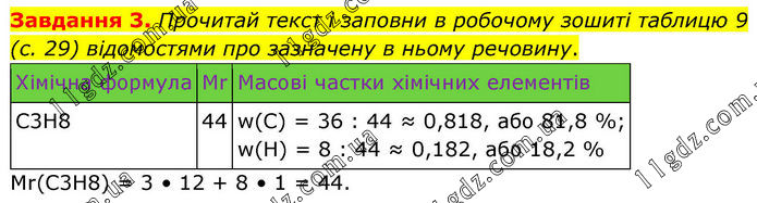 Завдання 3. Прочитай текст і заповни в робочому зошиті таблицю 9 (с. 29) відомостями про зазначену в ньому речовину. Хімічна формула Mr Масові частки хімічних елементів C3H8 44 w(C) = 36 : 44 ≈ 0,818, або 81,8 %; w(H) = 8 : 44 ≈ 0,182, або 18,2 % Mr(C3H8) = 3 • 12 + 8 • 1 = 44.