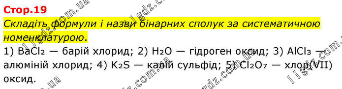 Складіть формули і назви бінарних сполук за систематичною номенклатурою. 1) BaCl₂ — барій хлорид; 2) H₂O — гідроген оксид; 3) AlCl₃ — алюміній хлорид; 4) K₂S — калій сульфід; 5) Cl₂O₇ — хлор(VII) оксид.