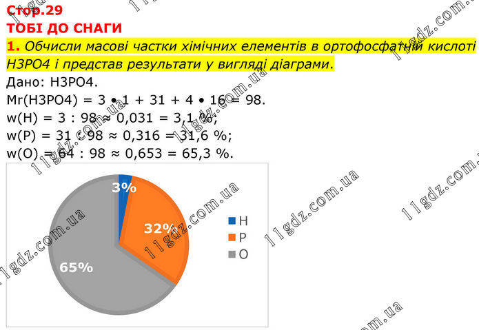 ТОБІ ДО СНАГИ 1. Обчисли масові частки хімічних елементів в ортофосфатній кислоті H3PO4 і представ результати у вигляді діаграми. Дано: H3PO4. Mr(H3PO4) = 3 • 1 + 31 + 4 • 16 = 98. w(H) = 3 : 98 ≈ 0,031 = 3,1 %; w(P) = 31 : 98 ≈ 0,316 = 31,6 %; w(O) = 64 : 98 ≈ 0,653 = 65,3 %.
