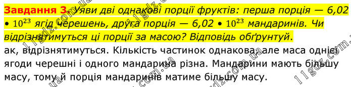 Завдання 3. Уяви дві однакові порції фруктів: перша порція — 6,02 • 10^23 ягід черешень, друга порція — 6,02 • 10^23 мандаринів. Чи відрізнятимуться ці порції за масою? Відповідь обґрунтуй. Так, відрізнятимуться. Кількість частинок однакова, але маса однієї ягоди черешні і одного мандарина різна. Мандарини мають більшу масу, тому й порція мандаринів матиме більшу масу.