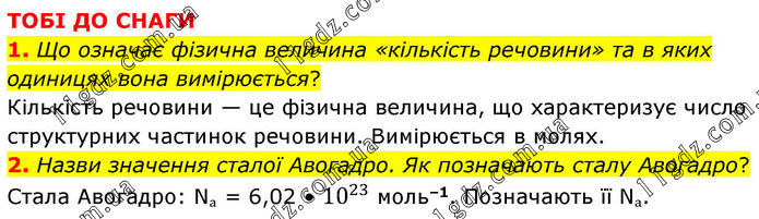 ТОБІ ДО СНАГИ 1. Що означає фізична величина «кількість речовини» та в яких одиницях вона вимірюється? Кількість речовини — це фізична величина, що характеризує число структурних частинок речовини. Вимірюється в молях. 2. Назви значення сталої Авогадро. Як позначають сталу Авогадро? Стала Авогадро: Nₐ = 6,02 • 10^23 моль–1. Позначають її Nₐ.