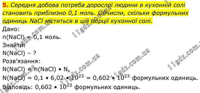 5. Середня добова потреба дорослої людини в кухонній солі становить приблизно 0,1 моль. Обчисли, скільки формульних одиниць NaCl міститься в цій порції кухонної солі. Дано: n(NaCl) = 0,1 моль. Знайти: N(NaCl) – ? Розв’язання: N(NaCl) = n(NaCl) • Nₐ. N(NaCl) = 0,1 • 6,02 • 10^23 = 0,602 • 10^23 формульних одиниць. Відповідь: 0,602 • 10^23 формульних одиниць.
