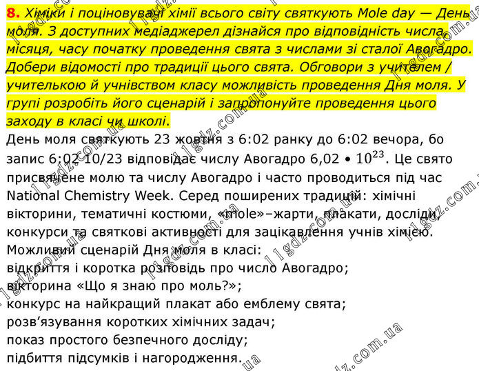 8. Хіміки і поціновувачі хімії всього світу святкують Mole day — День моля. З доступних медіаджерел дізнайся про відповідність числа, місяця, часу початку проведення свята з числами зі сталої Авогадро. Добери відомості про традиції цього свята. Обговори з учителем / учителькою й учнівством класу можливість проведення Дня моля. У групі розробіть його сценарій і запропонуйте проведення цього заходу в класі чи школі. День моля святкують 23 жовтня з 6:02 ранку до 6:02 вечора, бо запис 6:02 10/23 відповідає числу Авогадро 6,02 • 10^23. Це свято присвячене молю та числу Авогадро і часто проводиться під час National Chemistry Week. Серед поширених традицій: хімічні вікторини, тематичні костюми, «mole»–жарти, плакати, досліди, конкурси та святкові активності для зацікавлення учнів хімією. Можливий сценарій Дня моля в класі: відкриття і коротка розповідь про число Авогадро; вікторина «Що я знаю про моль?»; конкурс на найкращий плакат або емблему свята; розв’язування коротких хімічних задач; показ простого безпечного досліду; підбиття підсумків і нагородження.