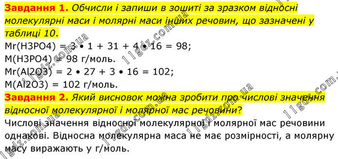Завдання 1. Обчисли і запиши в зошиті за зразком відносні молекулярні маси і молярні маси інших речовин, що зазначені у таблиці 10. Mr(H3PO4) = 3 • 1 + 31 + 4 • 16 = 98; M(H3PO4) = 98 г/моль. Mr(Al2O3) = 2 • 27 + 3 • 16 = 102; M(Al2O3) = 102 г/моль. Завдання 2. Який висновок можна зробити про числові значення відносної молекулярної і молярної мас речовини? Числові значення відносної молекулярної і молярної мас речовини однакові. Відносна молекулярна маса не має розмірності, а молярну масу виражають у г/моль.