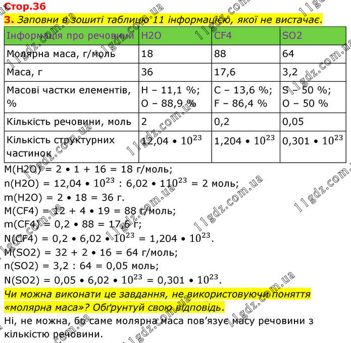 3. Заповни в зошиті таблицю 11 інформацією, якої не вистачає. M(H2O) = 2 • 1 + 16 = 18 г/моль; n(H2O) = 12,04 • 10^23 : 6,02 • 110^23 = 2 моль; m(H2O) = 2 • 18 = 36 г. M(CF4) = 12 + 4 • 19 = 88 г/моль; m(CF4) = 0,2 • 88 = 17,6 г; N(CF4) = 0,2 • 6,02 • 10^23 = 1,204 • 10^23. M(SO2) = 32 + 2 • 16 = 64 г/моль; n(SO2) = 3,2 : 64 = 0,05 моль; N(SO2) = 0,05 • 6,02 • 10^23 = 0,301 • 10^23. Чи можна виконати це завдання, не використовуючи поняття «молярна маса»? Обґрунтуй свою відповідь. Ні, не можна, бо саме молярна маса пов’язує масу речовини з кількістю речовини.