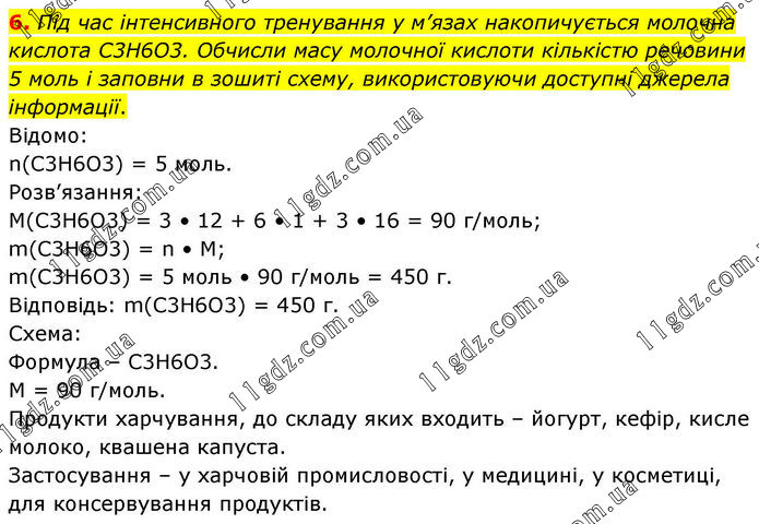 6. Під час інтенсивного тренування у м’язах накопичується молочна кислота C3H6O3. Обчисли масу молочної кислоти кількістю речовини 5 моль і заповни в зошиті схему, використовуючи доступні джерела інформації. Відомо: n(C3H6O3) = 5 моль. Розв’язання: M(C3H6O3) = 3 • 12 + 6 • 1 + 3 • 16 = 90 г/моль; m(C3H6O3) = n • M; m(C3H6O3) = 5 моль • 90 г/моль = 450 г. Відповідь: m(C3H6O3) = 450 г. Схема: Формула – C3H6O3. M = 90 г/моль. Продукти харчування, до складу яких входить – йогурт, кефір, кисле молоко, квашена капуста. Застосування – у харчовій промисловості, у медицині, у косметиці, для консервування продуктів.