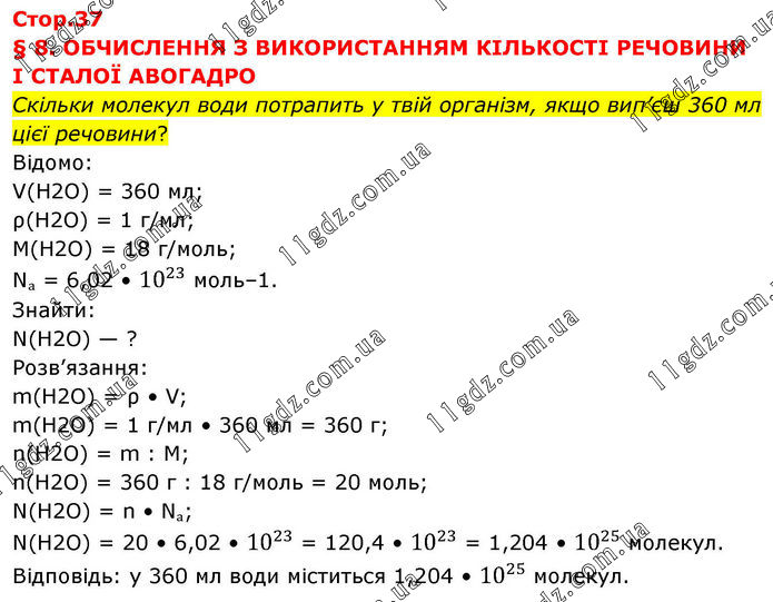§ 8. ОБЧИСЛЕННЯ З ВИКОРИСТАННЯМ КІЛЬКОСТІ РЕЧОВИНИ І СТАЛОЇ АВОГАДРО Скільки молекул води потрапить у твій організм, якщо вип’єш 360 мл цієї речовини? Відомо: V(H2O) = 360 мл; ρ(H2O) = 1 г/мл; M(H2O) = 18 г/моль; Nₐ = 6,02 • 10^23 моль–1. Знайти: N(H2O) — ? Розв’язання: m(H2O) = ρ • V; m(H2O) = 1 г/мл • 360 мл = 360 г; n(H2O) = m : M; n(H2O) = 360 г : 18 г/моль = 20 моль; N(H2O) = n • Nₐ; N(H2O) = 20 • 6,02 • 10^23 = 120,4 • 10^23 = 1,204 • 10^25 молекул. Відповідь: у 360 мл води міститься 1,204 • 10^25 молекул.