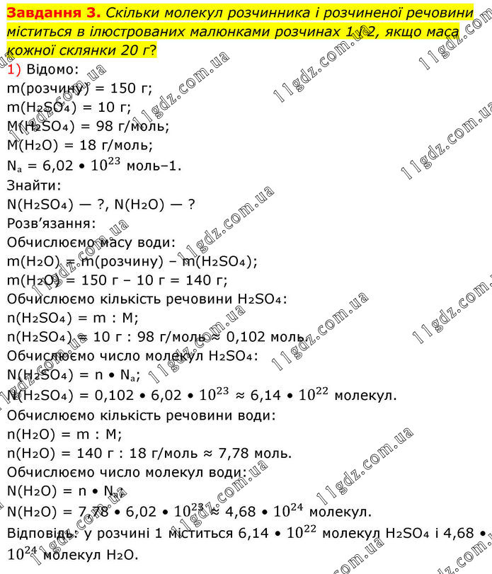 Завдання 3. Скільки молекул розчинника і розчиненої речовини міститься в ілюстрованих малюнками розчинах 1 і 2, якщо маса кожної склянки 20 г? 1) Відомо: m(розчину) = 150 г; m(H₂SO₄) = 10 г; M(H₂SO₄) = 98 г/моль; M(H₂O) = 18 г/моль; Nₐ = 6,02 • 10^23 моль–1. Знайти: N(H₂SO₄) — ?, N(H₂O) — ? Розв’язання: Обчислюємо масу води: m(H₂O) = m(розчину) – m(H₂SO₄); m(H₂O) = 150 г – 10 г = 140 г; Обчислюємо кількість речовини H₂SO₄: n(H₂SO₄) = m : M; n(H₂SO₄) = 10 г : 98 г/моль ≈ 0,102 моль. Обчислюємо число молекул H₂SO₄: N(H₂SO₄) = n • Nₐ; N(H₂SO₄) = 0,102 • 6,02 • 10^23 ≈ 6,14 • 10^22 молекул. Обчислюємо кількість речовини води: n(H₂O) = m : M; n(H₂O) = 140 г : 18 г/моль ≈ 7,78 моль. Обчислюємо число молекул води: N(H₂O) = n • Nₐ; N(H₂O) = 7,78 • 6,02 • 10^23 ≈ 4,68 • 10^24 молекул. Відповідь: у розчині 1 міститься 6,14 • 10^22 молекул H₂SO₄ і 4,68 • 10^24 молекул H₂O.