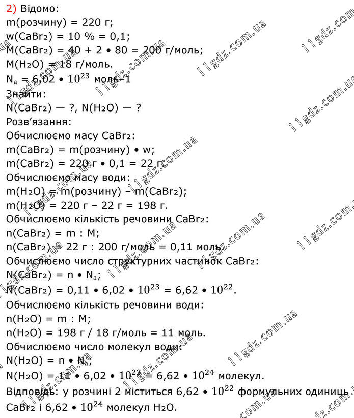 2) Відомо: m(розчину) = 220 г; w(CaBr₂) = 10 % = 0,1; M(CaBr₂) = 40 + 2 • 80 = 200 г/моль; M(H₂O) = 18 г/моль. Nₐ = 6,02 • 10^23 моль–1 Знайти: N(CaBr₂) — ?, N(H₂O) — ? Розв’язання: Обчислюємо масу CaBr₂: m(CaBr₂) = m(розчину) • w; m(CaBr₂) = 220 г • 0,1 = 22 г. Обчислюємо масу води: m(H₂O) = m(розчину) – m(CaBr₂); m(H₂O) = 220 г – 22 г = 198 г. Обчислюємо кількість речовини CaBr₂: n(CaBr₂) = m : M; n(CaBr₂) = 22 г : 200 г/моль = 0,11 моль. Обчислюємо число структурних частинок CaBr₂: N(CaBr₂) = n • Nₐ; N(CaBr₂) = 0,11 • 6,02 • 10^23 = 6,62 • 10^22. Обчислюємо кількість речовини води: n(H₂O) = m : M; n(H₂O) = 198 г / 18 г/моль = 11 моль. Обчислюємо число молекул води: N(H₂O) = n • Nₐ; N(H₂O) = 11 • 6,02 • 10^23 = 6,62 • 10^24 молекул. Відповідь: у розчині 2 міститься 6,62 • 10^22 формульних одиниць CaBr₂ і 6,62 • 10^24 молекул H₂O.