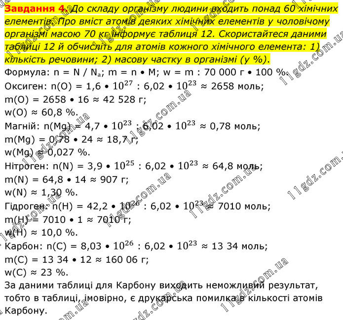 Завдання 4. До складу організму людини входить понад 60 хімічних елементів. Про вміст атомів деяких хімічних елементів у чоловічому організмі масою 70 кг інформує таблиця 12. Скористайтеся даними таблиці 12 й обчисліть для атомів кожного хімічного елемента: 1) кількість речовини; 2) масову частку в організмі (у %). Формула: n = N / Nₐ; m = n • M; w = m : 70 000 г • 100 %. Оксиген: n(O) = 1,6 • 10^27 : 6,02 • 10^23 ≈ 2658 моль; m(O) = 2658 • 16 ≈ 42 528 г; w(O) ≈ 60,8 %. Магній: n(Mg) = 4,7 • 10^23 : 6,02 • 10^23 ≈ 0,78 моль; m(Mg) = 0,78 • 24 ≈ 18,7 г; w(Mg) ≈ 0,027 %. Нітроген: n(N) = 3,9 • 10^25 : 6,02 • 10^23 ≈ 64,8 моль; m(N) = 64,8 • 14 ≈ 907 г; w(N) ≈ 1,30 %. Гідроген: n(H) = 42,2 • 10^26 : 6,02 • 10^23 ≈ 7010 моль; m(H) = 7010 • 1 ≈ 7010 г; w(H) ≈ 10,0 %. Карбон: n(C) = 8,03 • 10^26 : 6,02 • 10^23 ≈ 13 34 моль; m(C) = 13 34 • 12 ≈ 160 06 г; w(C) ≈ 23 %. За даними таблиці для Карбону виходить неможливий результат, тобто в таблиці, імовірно, є друкарська помилка в кількості атомів Карбону.