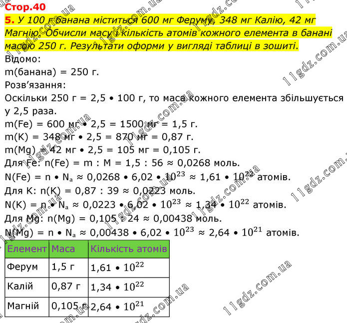 5. У 100 г банана міститься 600 мг Феруму, 348 мг Калію, 42 мг Магнію. Обчисли масу і кількість атомів кожного елемента в банані масою 250 г. Результати оформи у вигляді таблиці в зошиті. Відомо: m(банана) = 250 г. Розв’язання: Оскільки 250 г = 2,5 • 100 г, то маса кожного елемента збільшується у 2,5 раза. m(Fe) = 600 мг • 2,5 = 1500 мг = 1,5 г. m(K) = 348 мг • 2,5 = 870 мг = 0,87 г. m(Mg) = 42 мг • 2,5 = 105 мг = 0,105 г. Для Fe: n(Fe) = m : M = 1,5 : 56 ≈ 0,0268 моль. N(Fe) = n • Nₐ ≈ 0,0268 • 6,02 • 10^23 ≈ 1,61 • 10^22 атомів. Для K: n(K) = 0,87 : 39 ≈ 0,0223 моль. N(K) = n • Nₐ ≈ 0,0223 • 6,02 • 10^23 ≈ 1,34 • 10^22 атомів. Для Mg: n(Mg) = 0,105 : 24 ≈ 0,00438 моль. N(Mg) = n • Nₐ ≈ 0,00438 • 6,02 • 10^23 ≈ 2,64 • 10^21 атомів. Елемент Маса Кількість атомів Ферум 1,5 г 1,61 • 10^22 Калій 0,87 г 1,34 • 10^22 Магній 0,105 г 2,64 • 10^21