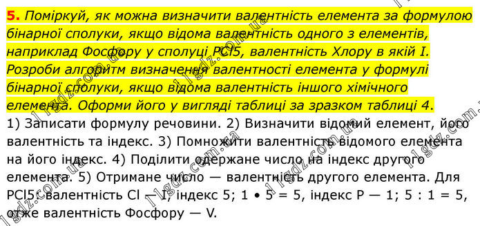 5. Поміркуй, як можна визначити валентність елемента за формулою бінарної сполуки, якщо відома валентність одного з елементів, наприклад Фосфору у сполуці РСl5, валентність Хлору в якій І. Розроби алгоритм визначення валентності елемента у формулі бінарної сполуки, якщо відома валентність іншого хімічного елемента. Оформи його у вигляді таблиці за зразком таблиці 4. 1) Записати формулу речовини. 2) Визначити відомий елемент, його валентність та індекс. 3) Помножити валентність відомого елемента на його індекс. 4) Поділити одержане число на індекс другого елемента. 5) Отримане число — валентність другого елемента. Для PCl5: валентність Cl — I, індекс 5; 1 • 5 = 5, індекс P — 1; 5 : 1 = 5, отже валентність Фосфору — V.
