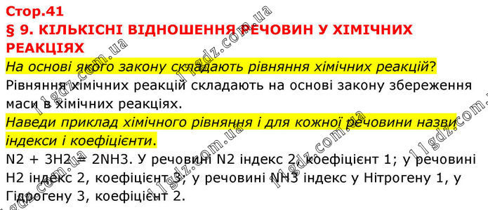 § 9. КІЛЬКІСНІ ВІДНОШЕННЯ РЕЧОВИН У ХІМІЧНИХ РЕАКЦІЯХ На основі якого закону складають рівняння хімічних реакцій? Рівняння хімічних реакцій складають на основі закону збереження маси в хімічних реакціях. Наведи приклад хімічного рівняння і для кожної речовини назви індекси і коефіцієнти. N2 + 3H2 = 2NH3. У речовині N2 індекс 2, коефіцієнт 1; у речовині H2 індекс 2, коефіцієнт 3; у речовині NH3 індекс у Нітрогену 1, у Гідрогену 3, коефіцієнт 2.
