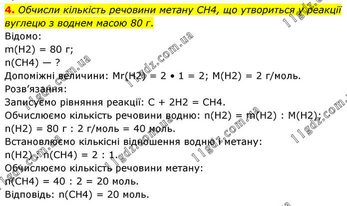 4. Обчисли кількість речовини метану СН4, що утвориться у реакції вуглецю з воднем масою 80 г. Відомо: m(H2) = 80 г; n(CH4) — ? Допоміжні величини: Mr(H2) = 2 • 1 = 2; M(H2) = 2 г/моль. Розв’язання: Записуємо рівняння реакції: C + 2H2 = CH4. Обчислюємо кількість речовини водню: n(H2) = m(H2) : M(H2); n(H2) = 80 г : 2 г/моль = 40 моль. Встановлюємо кількісні відношення водню і метану: n(H2) : n(CH4) = 2 : 1. Обчислюємо кількість речовини метану: n(CH4) = 40 : 2 = 20 моль. Відповідь: n(CH4) = 20 моль.