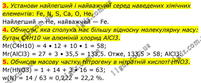 3. Установи найлегший і найважчий серед наведених хімічних елементів: Fe, N, S, Ca, О, He. Найлֶегший — He, найважчий — Fe. 4. Обчисли, яка сполука має більшу відносну молекулярну масу: бутан С4Н10 чи алюміній хлорид AlCl3. Mr(C4H10) = 4 • 12 + 10 • 1 = 58; Mr(AlCl3) = 27 + 3 • 35,5 = 133,5. Отже, 133,5 > 58; AlCl3. 5. Обчисли масову частку Нітрогену в нітратній кислоті HNO3. Mr(HNO3) = 1 + 14 + 3 • 16 = 63; w(N) = 14 / 63 ≈ 0,222 = 22,2 %.