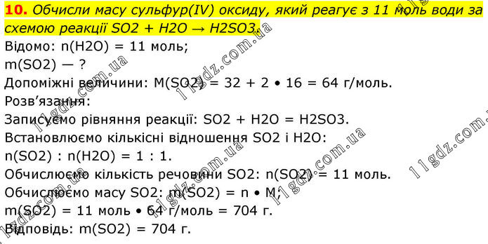 10. Обчисли масу сульфур(IV) оксиду, який реагує з 11 моль води за схемою реакції SO2 + Н2О → H2SO3. Відомо: n(H2O) = 11 моль; m(SO2) — ? Допоміжні величини: M(SO2) = 32 + 2 • 16 = 64 г/моль. Розв’язання: Записуємо рівняння реакції: SO2 + H2O = H2SO3. Встановлюємо кількісні відношення SO2 і H2O: n(SO2) : n(H2O) = 1 : 1. Обчислюємо кількість речовини SO2: n(SO2) = 11 моль. Обчислюємо масу SO2: m(SO2) = n • M; m(SO2) = 11 моль • 64 г/моль = 704 г. Відповідь: m(SO2) = 704 г.