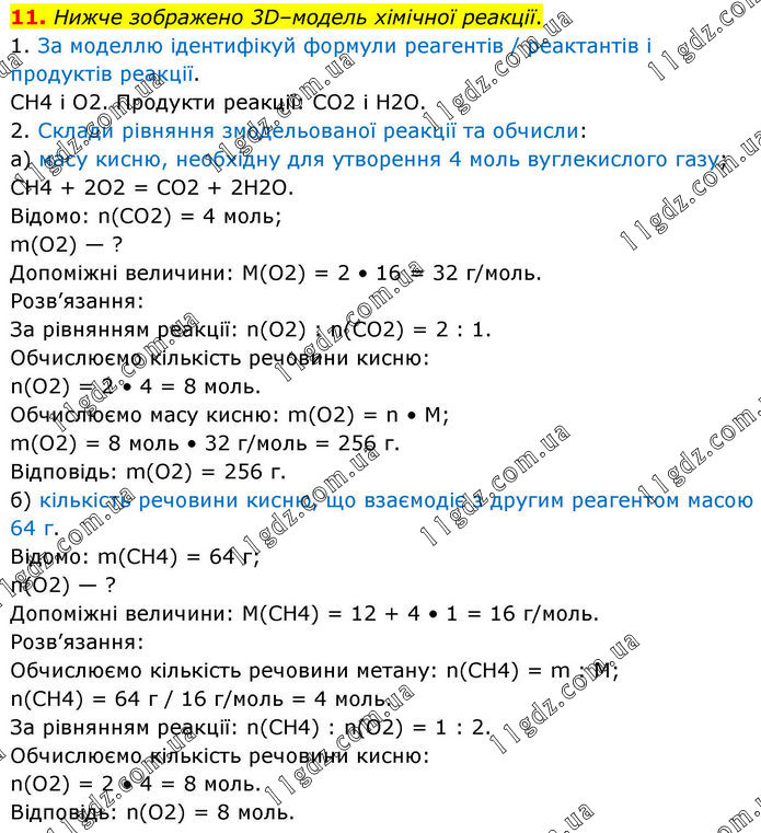 11. Нижче зображено 3D–модель хімічної реакції. 1. За моделлю ідентифікуй формули реагентів / реактантів і продуктів реакції. CH4 і O2. Продукти реакції: CO2 і H2O. 2. Склади рівняння змодельованої реакції та обчисли: а) масу кисню, необхідну для утворення 4 моль вуглекислого газу; CH4 + 2O2 = CO2 + 2H2O. Відомо: n(CO2) = 4 моль; m(O2) — ? Допоміжні величини: M(O2) = 2 • 16 = 32 г/моль. Розв’язання: За рівнянням реакції: n(O2) : n(CO2) = 2 : 1. Обчислюємо кількість речовини кисню: n(O2) = 2 • 4 = 8 моль. Обчислюємо масу кисню: m(O2) = n • M; m(O2) = 8 моль • 32 г/моль = 256 г. Відповідь: m(O2) = 256 г. б) кількість речовини кисню, що взаємодіє з другим реагентом масою 64 г. Відомо: m(CH4) = 64 г; n(O2) — ? Допоміжні величини: M(CH4) = 12 + 4 • 1 = 16 г/моль. Розв’язання: Обчислюємо кількість речовини метану: n(CH4) = m : M; n(CH4) = 64 г / 16 г/моль = 4 моль. За рівнянням реакції: n(CH4) : n(O2) = 1 : 2. Обчислюємо кількість речовини кисню: n(O2) = 2 • 4 = 8 моль. Відповідь: n(O2) = 8 моль.