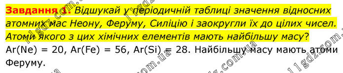 Завдання 1. Відшукай у періодичній таблиці значення відносних атомних мас Неону, Феруму, Силіцію і заокругли їх до цілих чисел. Атоми якого з цих хімічних елементів мають найбільшу масу? Ar(Ne) = 20, Ar(Fe) = 56, Ar(Si) = 28. Найбільшу масу мають атоми Феруму.