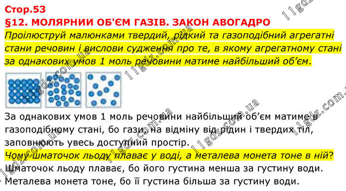 §12. МОЛЯРНИИ ОБ'ЄМ ГАЗІВ. ЗАКОН АВОГАДРО Проілюструй малюнками твердий, рідкий та газоподібний агрегатні стани речовин і вислови судження про те, в якому агрегатному стані за однакових умов 1 моль речовини матиме найбільший об’єм. За однакових умов 1 моль речовини найбільший об’єм матиме в газоподібному стані, бо гази, на відміну від рідин і твердих тіл, заповнюють увесь доступний простір. Чому шматочок льоду плаває у воді, а металева монета тоне в ній? Шматочок льоду плаває, бо його густина менша за густину води. Металева монета тоне, бо її густина більша за густину води.